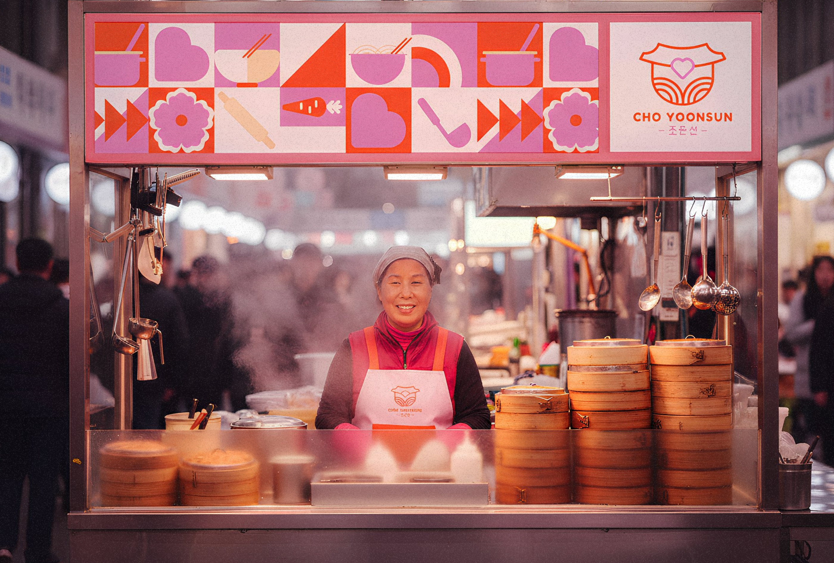 Cho Yoonsun es una marca ficticia inspirada en el documental Street Food: Asia de Netflix. Parte de una idea simple: el kalguksu como masa fresca, corte a cuchillo y caldo humeante como lenguaje principal. La esencia vive en el oficio del mercado, el ritmo diario, manos expertas y hospitalidad. Este proyecto traduce esa calidez y ese carácter directo en un sistema de identidad pensado para empaques, posters y piezas digitales, donde lo más importante es lo esencial: textura artesanal, vapor y una invitación clara a comer de verdad.